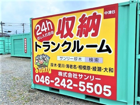 神奈川県愛甲郡愛川町でトランクルーム・レンタル倉庫をお探しなら、株式会社サンリーが運営する「愛川町中津B」へどうぞ。JR相模線下溝駅が最寄駅。車横付け・平置き・24時間利用可能、屋外型