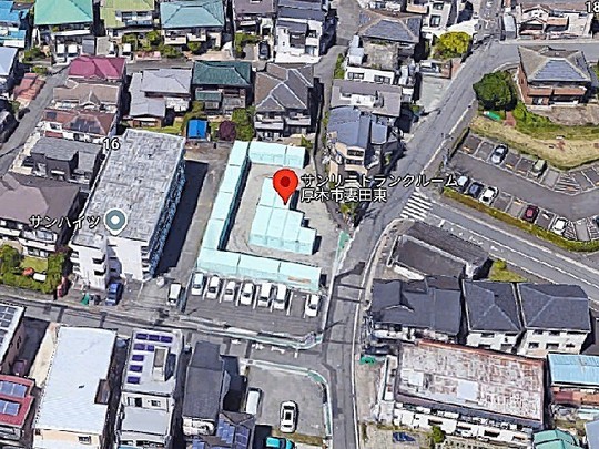 • 上空から見た[妻田東]施設。入口は2か所。コの字型に配列しています