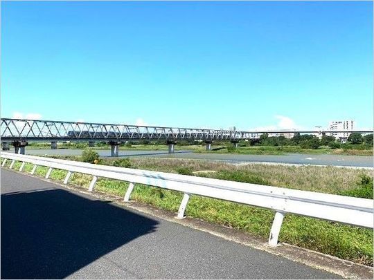 施設入口前ガードレールの向こう側は相模川です