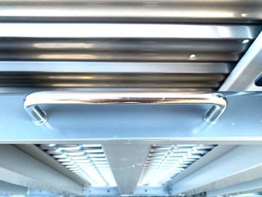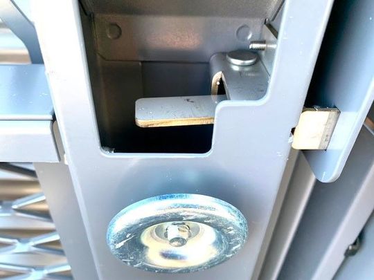 スロープを下げる動作をご説明いたします。画像の四角の金具を左右同時にの押しながら固定解除します