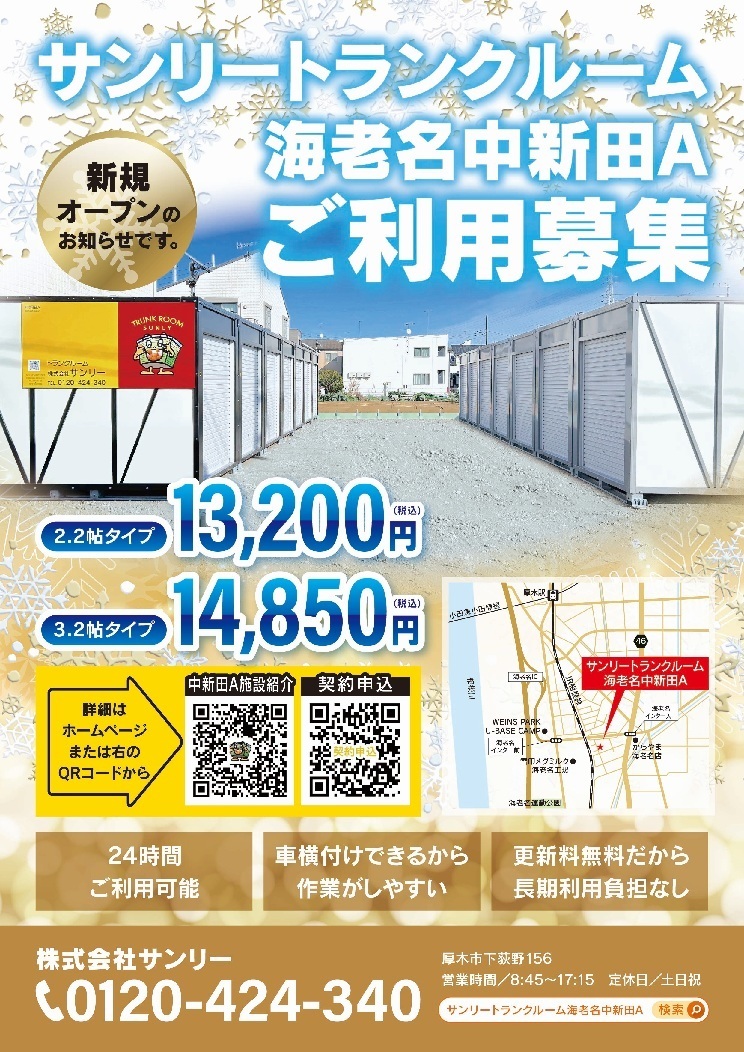 神奈川県海老名市でトランクルーム・レンタル倉庫をお探しなら、株式会社サンリーが運営する「海老名中新田A」へどうぞ。小田急小田原線厚木駅・JR相模線厚木駅が最寄駅。車横付け・平置き・24時間利用可能、屋外型