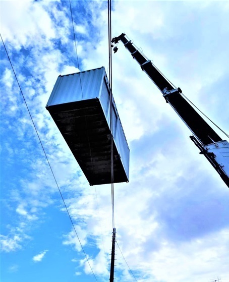 20㌳コンテナをクレーンで釣りあげます