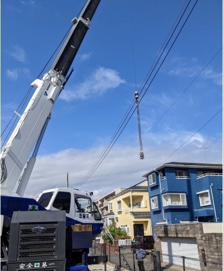 • 重機クレーン大型車両が慎重に定位置迄